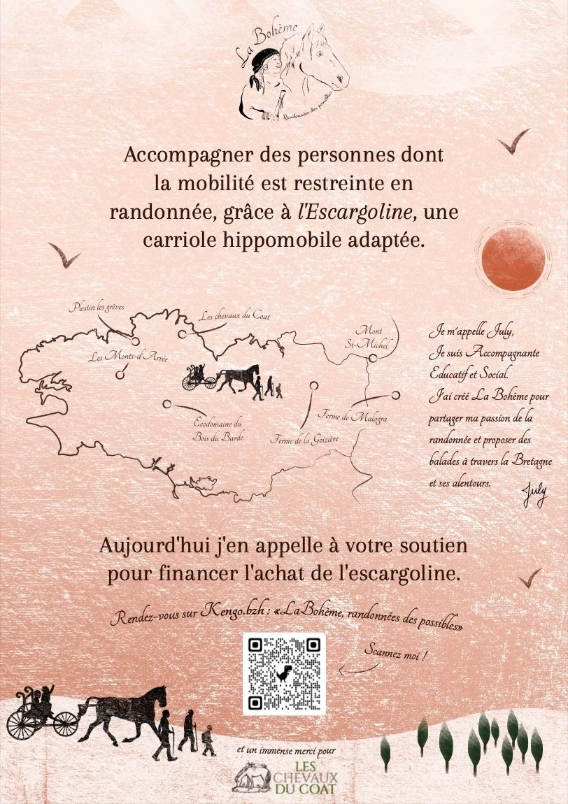Un projet merveilleux, tissé autour d’une rencontre, celle de July et de sa jument, Götten. Ensembles, elles sillonnent les chemins de la Bretagne et d’ailleurs. Grâce à l’Escargoline, une charette adaptée, elles transportent dans leurs aventure des personnes âgées, des enfants en situation en de handicap ou toute personne dont la mobilité est réduite.